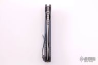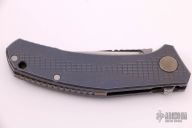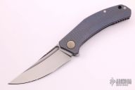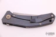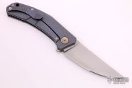 This Jeans Flipper is a collaborative effort between Dmitry Sinkevich and the Shirogorov brothers. It features an upswept blade with fullers, notched thumbrest and flipper. The handle is comprised of a titanium frame with machined handle and anodized, bronzed pivot, backspacer and an anodized tip up pocket clip. Lanyard hole. Great blade seating, detent and lock up. Flips smoothly on a multi row bearing system. Includes original box and microfiber cloth. Excellent condition. #164/200 inside frame along with the Shirogorov logo and the Sinkevich Design logo.