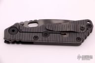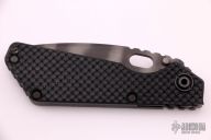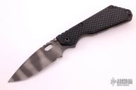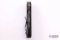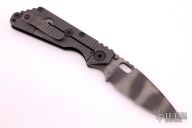 This SNG framelock folder by Mick Strider features a stonewashed blade and a dimple pattern black G-10 and flamed titanium frame and tip up titanium clip. Includes a "Lock Bar Stabilizer" for maximum reverse lock retention. Nice detent, lockup and blade seating. New condition.