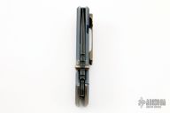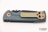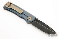 This Chaves American Made Knives Redencion 228 is frame lock folder based on the popular Redencion custom knife made by Ramon Chaves. It features a black oxide (added by Sean Campbell) tumbled drop point blade with swedge, notched thumbrest and dual thumbstuds. The handle is comprised of an anodized (done by Sean Campbell) titanium frame over a mokuti backspacer (done by Sean Campbell), anodized (done by Sean Campbell) tip up skull pocket clip is positioned for right hand, tip up carry. Great blade seating, detent and lock up. The pivot hardware has been bronzed (done by Sean Campbell). Has some scuffs and scratches on the blade and clip, otherwise excellent condition.