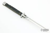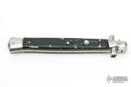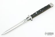 This Swivel Bolster from ACK Italy features a polished blade. The handle is comprised of stainless steel bolsters and pommel and black/white scales over brass liners and steel backspacer. Has a couple light scratches, otherwise excellent condition. Comes with original and sheath.