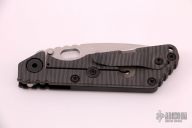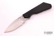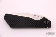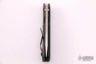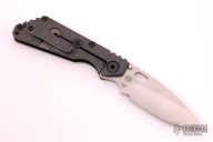 This SNG framelock folder by Mick Strider features a stonewashed blade and a dimple pattern black G-10 and flamed titanium frame and tip up titanium clip. Includes a "Lock Bar Stabilizer" for maximum reverse lock retention. Nice detent, lockup and blade seating. New condition.