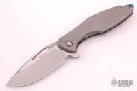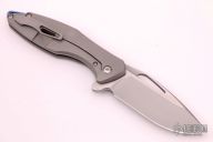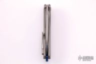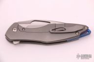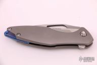 This Arius by Koenig knives features a two-tone blade with thumbhole and flipper. The handle has a bead blasted titanium frame with an anodized tip up clip, blue anodized titanium backspacer. Has ceramic bearings and a ceramic detent ball. Nice detent, lockup and blade seating. Comes with original box and COA dated Dec 14th, 2021.  New condition.