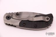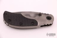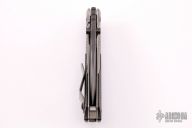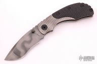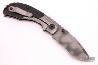 This RCC framelock by Mick Strider features a nightmare grind recurve blade with notched thumbrest and dual thumbstuds. The handle has a titanium frame with black G-10 scales, tumbled titanium backspacer and tip up titanium clip. Nice detent, lockup and blade seating. Has a couple light scratches, otherwise excellent condition.