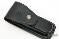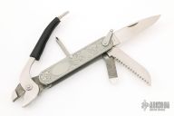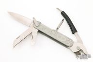 This 4x4 Tool Mate from Al Mark Knives features a drop point blade, a saw blade, nail file/pry bar combo and Phillips head screwdriver. Also includes pliers with a leather wrapped handle. Lanyard bail rotates over the plier handle to lock closed when not in use. The handles have been engraved by Robert Valade. Comes with a black leather sheath. Excellent condition.