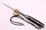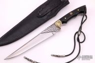 This Knife by Marugut Knives features a satin finished blade with a false top edge, .245" blade stock and 1.251" blade depth, full tang construction. The blade spine and tang have been "Chain" fileworked. The handle has engraved brass bolsters, black paper micarta scales with thin white liners, brass and mosaic pins. Comes with a hand tooled black leather sheath and COA. New from maker.