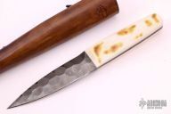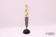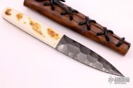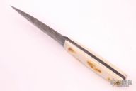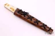 This Prehistoric Dagger by Attila Kertesz has a blackened flint knapped style blade with full tang construction, .373" blade stock and 1.184" depth, full tang construction. The handle has giraffe bone scales with hidden pins. Comes with a brown leather sheath. New from maker, Comes with a COA dated 11-14-2021. Comes with a magnetic stand.