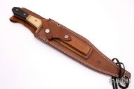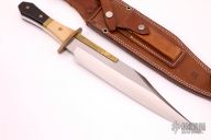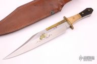 This Presentation Bowie by Al Mar was made for the Japanese market only, it features a satin finished clip point blade with false top edge and brass parry guard, .311" blade stock and 2.091" blade depth, full tang construction. The handle has a brass guard, ivory and black paper micarta scales with brass spacer. Comes with original brown leather sheath. Has some patina on the brass, otherwise excellent condition.