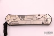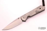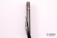 This Large Sebenza 21 CGG "Side Arm", by Chris Reeve Knives features a stonewashed blade with single titanium thumbstud, notched thumbrest. The frame is bead blasted titanium with matching tip up clip; the front scale is satin finished with the computer generated graphic. Nice detent, lockup and blade seating. Comes with original box, sheath and papers dated May 31, 2016. Excellent condition.