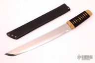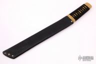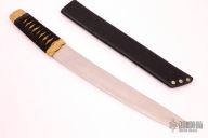 This Long Kwaiken Short Sword by Phill Hartsfield features a satin finished chisel ground tanto blade, .098" blade stock and 1.441" blade depth, hidden tang construction. The handle has epoxied cord wrap over tan epoxied cord. Comes with a black leather covered, paper lined, metal sheath. Excellent condition. The blade is inscribed with "God be between you and danger in all the empty places you walk"