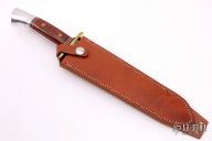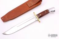 This knife is over 25 years old. Mirror polished bowie blade with fullers, 0.152" blade stock and 1.257" blade depth, full tang construction. The handle has a brass guard, wood handle with black/white/red spacers and an aluminum butt. Comes with a brown leather sheath. Blade stamped "WESTERN U.S.A. W46-8 N". Has a few light scratches, excellent condition.