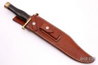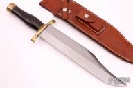 This Model 12-11 Smithsonian Bowie by Randall Made Knives features a satin finished carbon steel blade with sharpened top edge, .350" blade stock and 2.200" blade depth, hidden tang construction. The handle has a lugged brass guard/butt and a black linen micarta grip. Comes with a brown leather sheath. Has some light scratches and patina, otherwise excellent condition for its age.