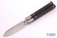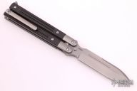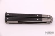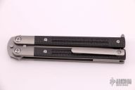 The SPD Invictus-Bali is a utility butterfly knife, featuring titanium billet handles with carbon fiber scales, a Böhler M390 blade, bronze bushing pivot, and a titanium spring latch. Additional details include jimping on the ears and back spacers, and a billet titanium pocket clip. Comes with a zippered case. Excellent condition.