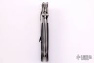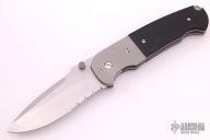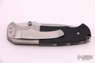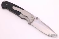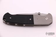 This ADV linerlock features a bead blasted partially serrated blade with notched thumbrest and checkered thumbstuds. Bead blasted titanium bolsters with black G-10 scales, blasted titanium liners and tip down clip. Smooth action with a nice detent, lockup and blade seating. Has some light scuffs, otherwise excellent condition.