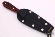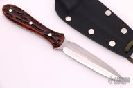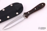 This Neck Dagger features a double edged San Mai blade with .117" blade stock and .895" blade depth, full tang construction. The handle has jigged bone scales with nickel silver pins. Comes with a kydex neck sheath. RARE. Excellent condition. We have never seen a dagger by Murray Carter.