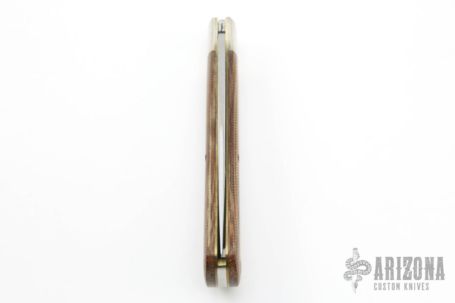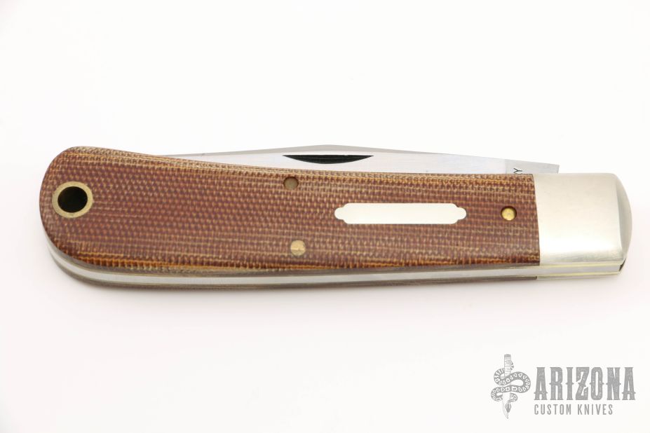 This Trapper by Great Eastern Cutlery features a high satin polished clip point blade with nail nick. The handle has nickel silver pinched bolsters, micarta covers, brass liners/pins/lanyard hole. Stainless steel escutcheon. Has half stop. Comes with wax paper and leather slip. Excellent condition.