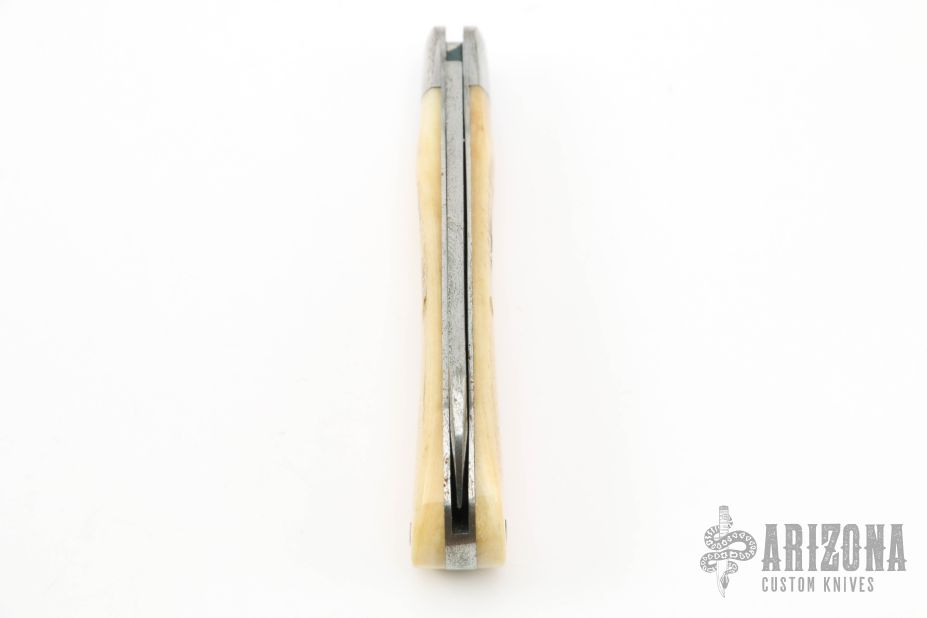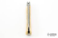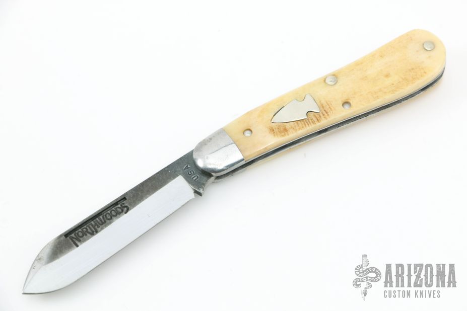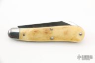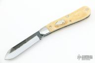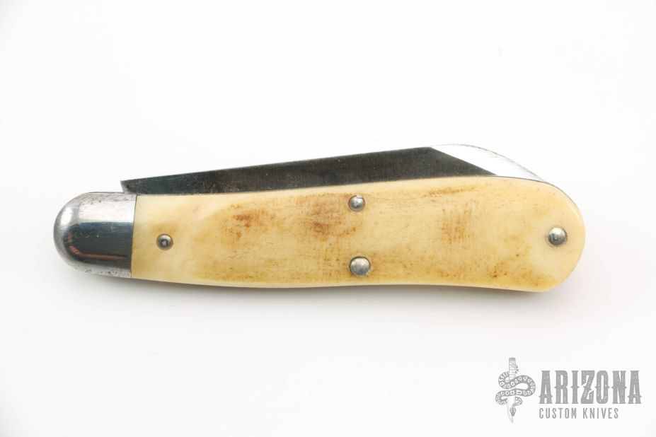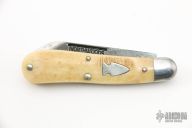 This Burnside Jack slipjoint by Great Eastern Cutlery features a two-tone satin finished blade with nail nick. The handle has stainless bolsters and liners, nickel silver escutcheon and pins, and calico bone covers. Comes with original wax paper and leather slip. Has some patina, otherwise excellent condition.