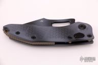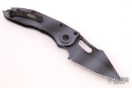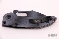 This Stitch Auto by Microtech Knives features an urban camo finished partially serrated blade and false top edge, notched thumb and finger rests. The handle has an urban camo milled aluminum handle with a bronzed titanium backspacer and a black stainless steel clip, tip up carry, lanyard hole at the butt. S/N of 3860 and dated 01/2018. Has a little wear on the edges of the clip, otherwise excellent condition.
