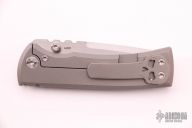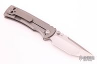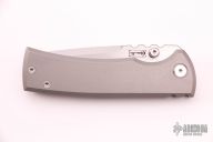 This Chaves Ultramar Redencion Tanto features a satin finished blade with the Chaves logo, dual thumbstuds, and notched thumbrest. The handle is made up of tumbled titanium, skull pocket clip (positioned for tip up carry), and a matching titanium backspacer. Has overtravel stop. Blade is centered when closed, and locks up with no play. Comes with box and additional clip. New from maker.
