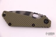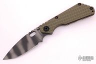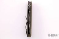 This SNG framelock folder by Mick Strider features a stonewashed blade and a dimple pattern green G-10 and flamed titanium frame and tip up titanium clip. Includes a "Lock Bar Stabilizer" for maximum reverse lock retention. Nice detent, lockup and blade seating. Excellent condition.
