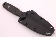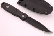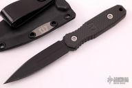 This Dagger by Blackside Customs features a black cerakote finished double-edged blade with fullers, .125" blade stock and .867" blade depth, full tang construction. The handle is black carbon fiber. Comes with a black kydex sheath with logo plate and soft loop. Comes with COA and original box. Has some light sheath marks. Excellent condition.