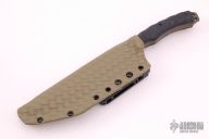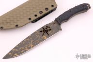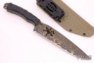 This Tactical Rifleman Cretan by Kraken Tactical features a laser engraved blade with notched thumbrest, .188" blade stock and 1.445" blade depth, full tang construction. The handle has black G-10 scales with brass liners, extended tang with lanyard hole. Comes with a kydex sheath with belt clip and original box. Excellent condition.