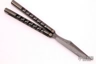 This Balisong by Vincenzo Fiore features a DLC coated Damasteel blade with false top edge. The handles are integral titanium channel construction that have been skeletonized and DLC finished. Latchless. Comes with original zippered case and COA dated 2021 and #3/8. Has two very fine and minute scratches on the handles, otherwise excellent condition. Very classy balisong!