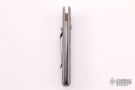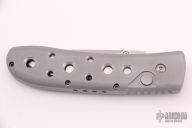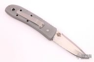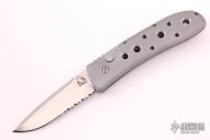 This is a Woodard Knives Fer De Lance side opening automatic with a bead blasted partially serrated blade and bead blast finish aluminum frame. Stainless steel clip, tip down carry. Has a couple light scuffs, otherwise excellent condition.