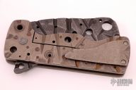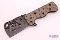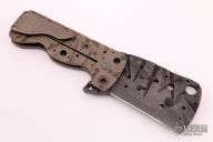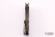 This ZL Zombie Killer by RichMade Knives features a dark tumbled cleaver style blade with rock pattern flats and a flipper. The handle has an anodized and textured titanium frame with a matching tip up clip. Great blade seating, detent and lock up, rides on bearings. Includes a zippered case and COA dated 5-20-2014. Excellent condition.