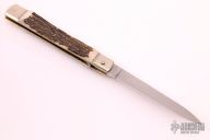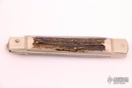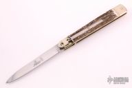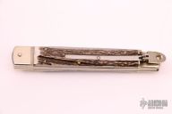 This leverlock auto by Hubertus features a drop point blade, nickel silver double bolsters, stag scales, and brass liners and pins. Opens with a nice snap. Very fast opening. Has scuffs and scratches, good condition. Small hitch while closing, spring pokes out just a touch.