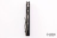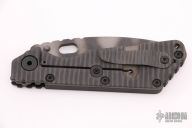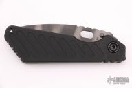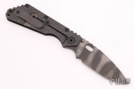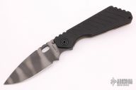 This Mick Strider SMF Fatty framelock folder features a tiger stripe blade with thumbhole and notched thumbrest. The handle has a black aluminum and flamed titanium frame with titanium clip, tip up carry. Jimping on blade spine. Nice lockup, detent, and blade seating. Excellent condition.
