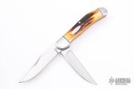 This canoe folder by Bill Ruple features two hand rub satin finished blades with nail nicks. The handle has threaded double stainless steel bolsters, and stag covers with a stainless steel escutcheon. Half-stop on blades, flush in all positions. Extremely well-matched scales. Outstanding fit and finish. Comes with a Velcro sheath. Has a few light scratches, otherwise excellent condition.