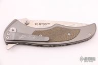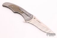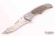 This Tighe Coon button lock flipper features a fluted satin finish blade and fully sculpted bead blasted titanium frame with green canvas micarta inlays. Titanium clip, tip down carry. Smooth and fast flipper opening that requires no wrist action. Nice blade seating and lockup. Comes with Velcro sheath, excellent condition.