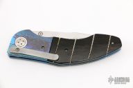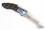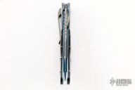 This Creedmore linerlock folder by Allen Elishewitz features a two-tone hand rub satin finished tanto recurve Damascus blade with notched thumbstud. The handle has mokuti bolsters, twisted silver inlays, wood scales, anodized liners, and a tip down bead blasted stainless steel clip. Comes with a zipper case. Nice lockup and blade seating. Light detent. Has some light scuffs and scratches, otherwise excellent condition.