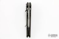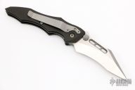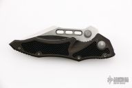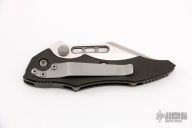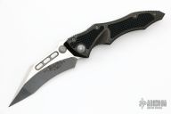 This Vector manual folder from Microtech features a black blade with dual thumb studs and notched thumb ramp. The handle is comprised of black anodized aluminum frame with non slip inserts over bronzed barrel spacers. Stainless steel inlaid lockbar. Tip down clip. Comes with original box. Excellent condition.