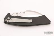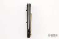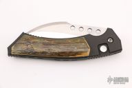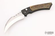 This Hawk side-opening automatic by Microtech knives has been customized by Reese Weiland, it features a two-tone blade with mirror polished grinds and satin finished flats. The handle has a black aluminum frame with a mammoth ivory overlay, bead blasted stainless steel tip down clip. Comes with a zippered case. Excellent condition.