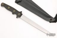 This Vorpal 1-C by Tom Maringer features a bead blast finished tanto blade with notched thumb and finger rests, full tang construction, .241" Blade Stock, 1.065" Blade Depth. The handle has black linen micarta scales. Includes a kydex sheath with shoulder harness. Excellent condition.