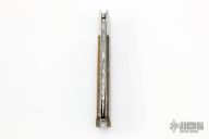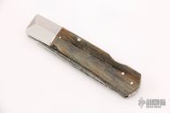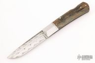 This Lockback by Ken Steigerwalt features a Damasteel blade with long pull nail nick. The handle has pinched and sculpted stainless steel bolsters, mammoth ivory scales, fileworked stainless steel liners and backspacer with gold pins. Comes with zippered case. Excellent condition.