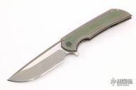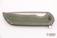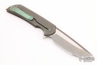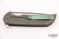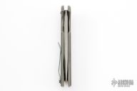 This Mordax by Ferrum Forge features a tumbled and satin finished blade with false top edge and flipper. The handle is comprised of a milled/tumbled titanium frame, anodized titanium barrel spacers, pivot and a tip up anodized titanium clip. Nice detent, lockup and blade seating. Comes with nylon zippered case. Has some scuffs and scratches on the blade and handle, otherwise great condition.
