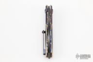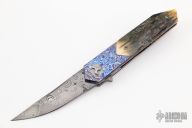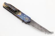 This Kaiken by Glenn Waters features a Chad Nichols Stainless Damascus blade. The handle has mokuti bolsters with custom mammoth ivory scales done by Adams International Knifeworks , flamed finished titanium liners, laser engraved and anodized titanium backspacer and tip up clip. There is a ceramic ball inlaid into the pocket clip. Rides on bearings, nice detent, lockup and blade seating. Includes original zippered case, box, carbon fiber scales and pivot tool. Dated 2018 inside backspacer. Excellent condition.