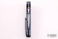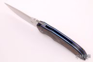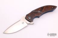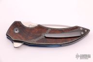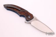 This M44 flipper by Andre Van Heerden features a hand rub satin finished blade with notched thumbrest and flipper. Includes Ceramic IKBS (Ikoma-Korth Bearing System) for fast and smooth flipper opening that requires no wrist action. The handle has carbon fiber scales with ironwood burl inlays, anodized titanium liners, carbon fiber backspacer, and a tip up zirconium clip. Nice blade seating, detent, and lockup. Comes with a velcro case. Excellent condition.