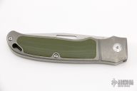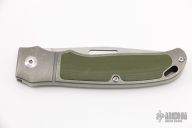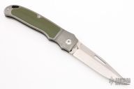 This New York Special slipjoint by JE Made features a stonewashed clip point blade with false top edge and thumbhole/nail nick. The handle has a tumble finished titanium frame with faux bolster and green G-10 inlays, tumbled stainless steel spring, lanyard hole at the butt. Has half-stop, flush in all positions. Excellent condition.
