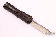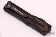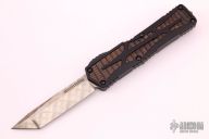 This Colossus by Heretic Knives features a Vegas Forge Damascus tanto blade with fullers. The handle has a black aluminum frame with beautiful seamless brown monitor lizard inlays, checkered thumb slide, black stainless steel tip down clip. Comes with original box, zippered case and COA dated 08/21 and s/n 049. Excellent condition.