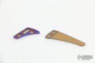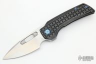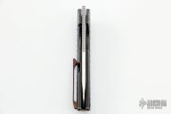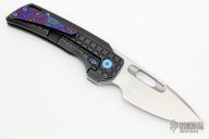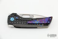This Nymble Framelock Flipper by EMP EDC features a satin finished blade with notched thumbrest and flipper, and a thumbhole. The handle has a black tumbled and frag pattern milled frame, anodized titanium backspacer and tip up Mokuti clip, upgraded titanium hardware. Comes with an upgraded mokuti backspacer an original titanium clip. Comes with original box, papers and original hardware. Rides on bearings, nice detent, lockup and blade seating. Excellent condition.