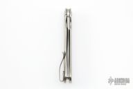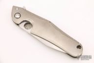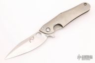 This ACE from Brad Southard is a Liong Mah design, featuring a hand-rubbed satin finish blade, and a contoured and textured orange peel finish titanium frame. Orange peel finish titanium clip. Smooth and fast flipper opening that requires no wrist action. Nice detent, blade seating and lockup. Excellent work. Has a couple of very light scratches on blade, but otherwise excellent condition. Comes with a zippered case.