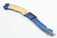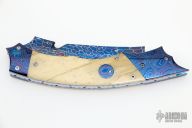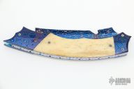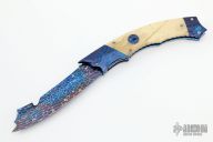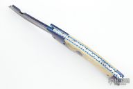 This Hyperion from Rainy Vallotton is a side-opening automatic with a Chad Nichols blued Damascus blade, Chad Nichols Damascus double bolsters, and bone scales. File work on the stainless steel backspacer and all around the anodized titanium liners. Strong and fast leaf spring action. Nice action, blade seating and lockup. Beautiful materials. Excellent work. Includes original box. Excellent condition.