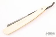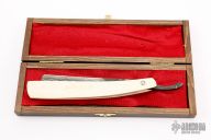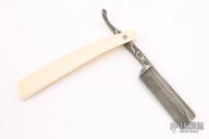 This Straight Razor by Mastro Livi features a San Mai Damascus blade with fileworked spine. The handle has mammoth ivory scales. Comes with original box. Excellent condition. Razor sharp.