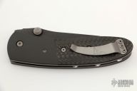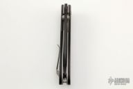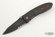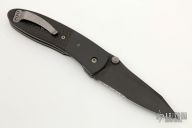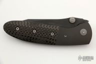 This Lightfoot LCC M/A by Microtech Knives is a Greg Lightfoot design, it has a black partially serrated blade with dual thumbstuds and a notched thumbrest. The handle has black aluminum bolsters, carbon fiber scales, stainless steel liners and clip, and holes for a tip up clip, but no clip. Dated 07/2001, #5111. Comes with a soft pouch. Excellent condition.