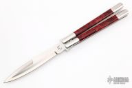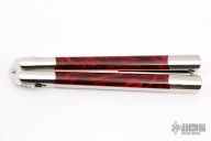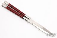 This balisong by 29 Knives features a satin finished blade with sharpened top edge. The handle has integral 303 stainless steel handles with dovetailed red dyed spalted maple Inlays. Includes a padded zippered case, box and COA. Has a few very light scratches, otherwise excellent condition.