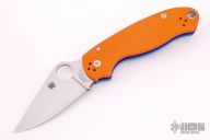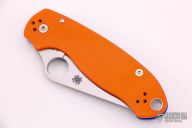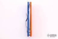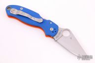 This Para 3 by Spyderco features a satin finished clip point REX45 blade with thumb hole and notched thumbrest. The handle is comprised of an orange and blue G-10 frame over nested steel liner and stand offs. The steel pocket clip is 4 way adjustable. Includes original box and paperwork. Excellent condition.