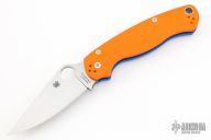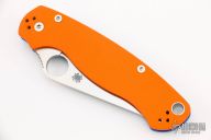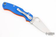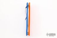 This Para 2 by Spyderco features a satin finished clip point REX45 blade with thumb hole and notched thumbrest. The handle is comprised of an orange and blue G-10 frame over nested steel liner and stand offs. The steel pocket clip is 4 way adjustable. Includes original box and paperwork. Excellent condition.